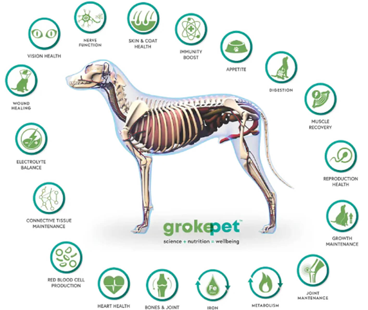 Groke Pet supplements are crafted from a carefully selected blend of natural ingredients, including essential vitamins, minerals, amino acids, and Omega-3 fatty acids.