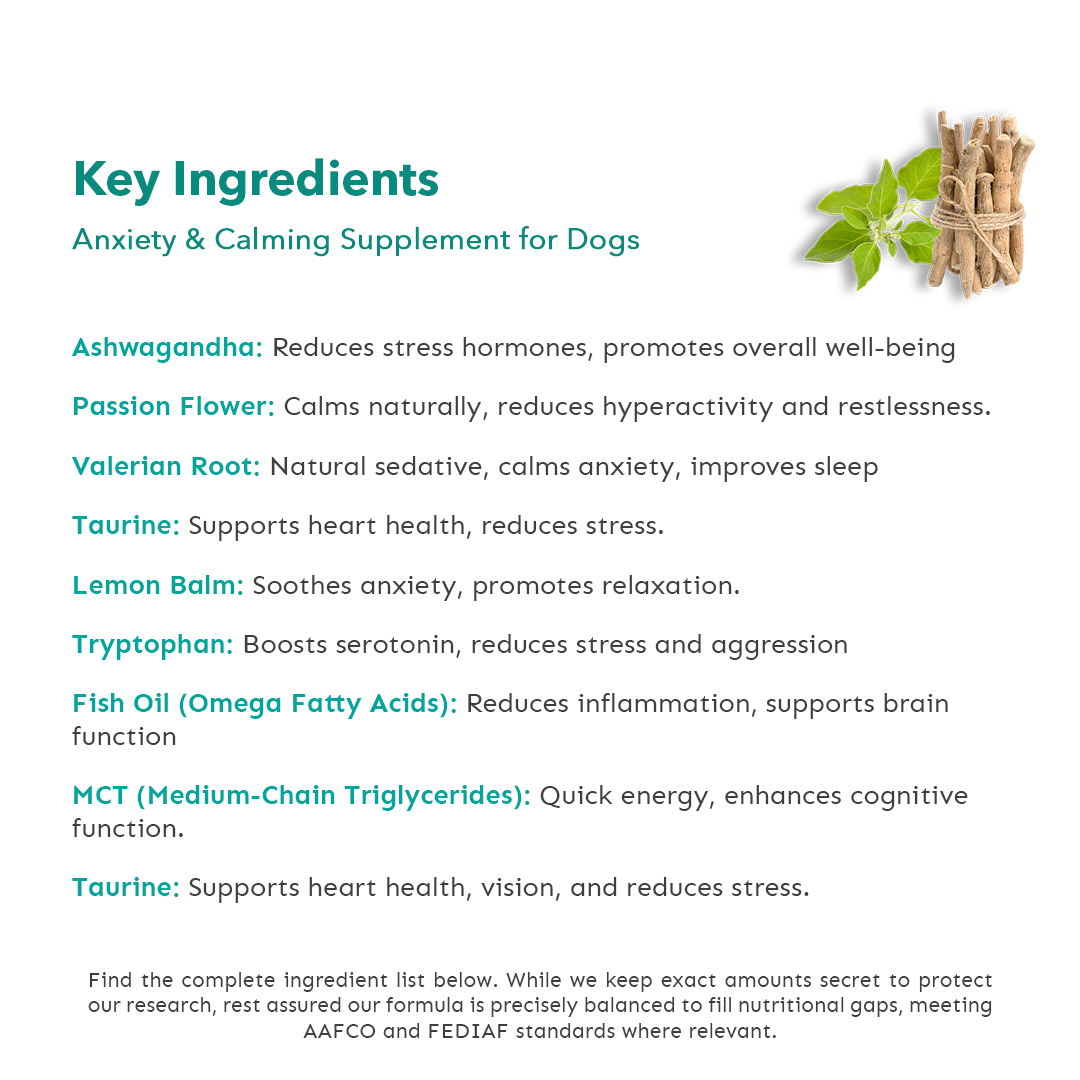 Calm anxious dogs with potent natural ingredients like Ashwagandha, Valerian Root, and L-Tryptophan.